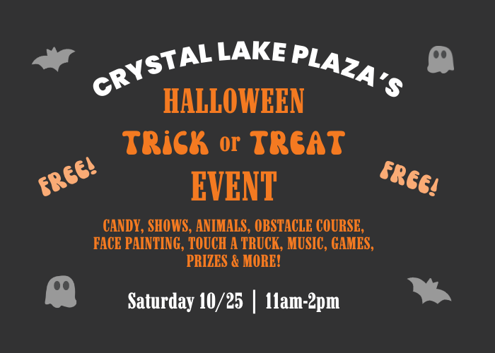 Join us for a spooktacular day of family fun at Crystal Lake Plaza’s Trick or Treat Halloween Event on Saturday, October 25th, from 11am to 2pm! Gather your friends and family for an exciting lineup of trick-or-treating, shows, games, and more. Here’s a sneak peek of what’s in store: