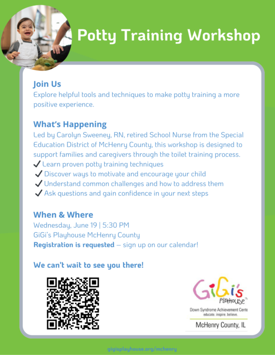 Explore helpful tools and techniques to make potty training a more positive experience. What’s Happening Led by Carolyn Sweeney, RN, retired School Nurse from the Special Education District of McHenry County, this workshop is designed to support families and caregivers through the toilet training process. ✔ Learn proven potty training techniques ✔ Discover ways to motivate and encourage your child ✔ Understand common challenges and how to address them ✔ Ask questions and gain confidence in your next steps When & Where Wednesday, June 19 | 5:30 PM GiGi’s Playhouse McHenry County Registration is requested – sign up on our calendar! https://gigisplayhouse.org/mchenry/sfcalendar We can’t wait to see you there!